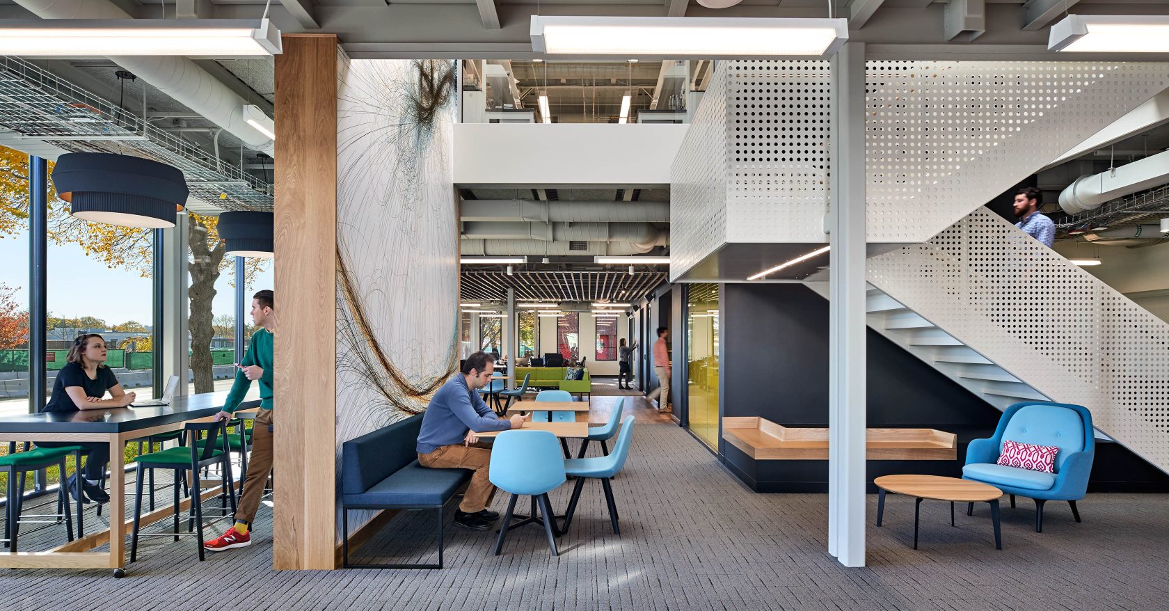 The space boasts both exposed and concealed MEPs in the front-of-house spaces to give a fine finished look in key areas and an exposed lab-feel to other areas.